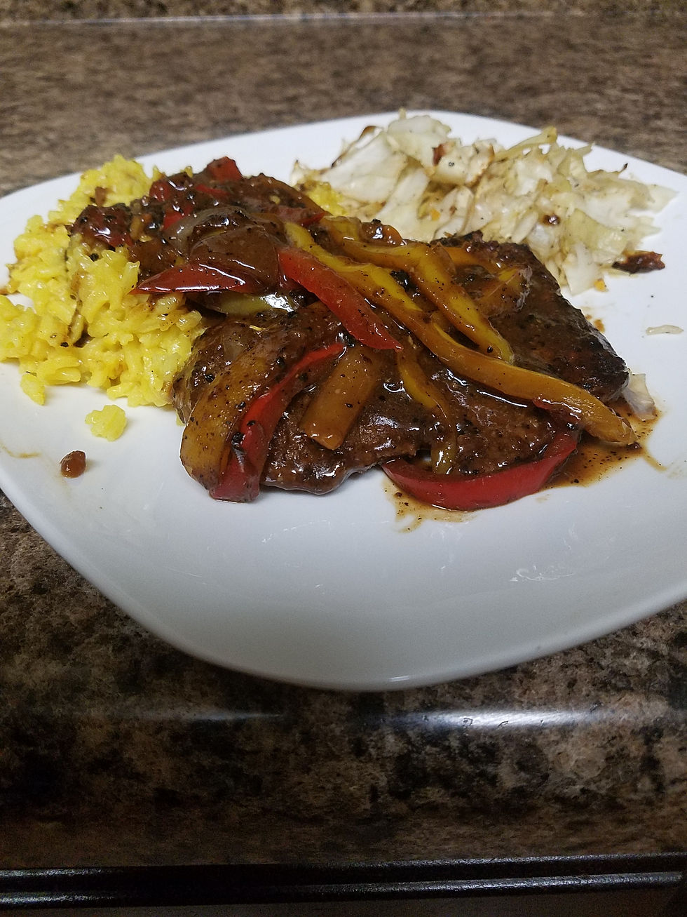 Yesterday I had a taste for something savory! So on the menu was Peppersteak, yellow rice, and baked cabbage! It's something so comforting about southern food but it's not the healthiest! So why does it make me feel so fricken good? I would say because I'm a TAURUS! DUH! But in truth Food is my safe haven! It's what I feel I deserve when I have a accomplishment and face failures. Yet it's the main thing I cut out when trying to reach my Goals!